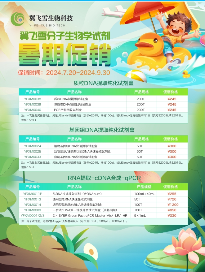 翼飞雪暑期促销:DNA提取试剂盒、RNA提取试剂盒、qPCR