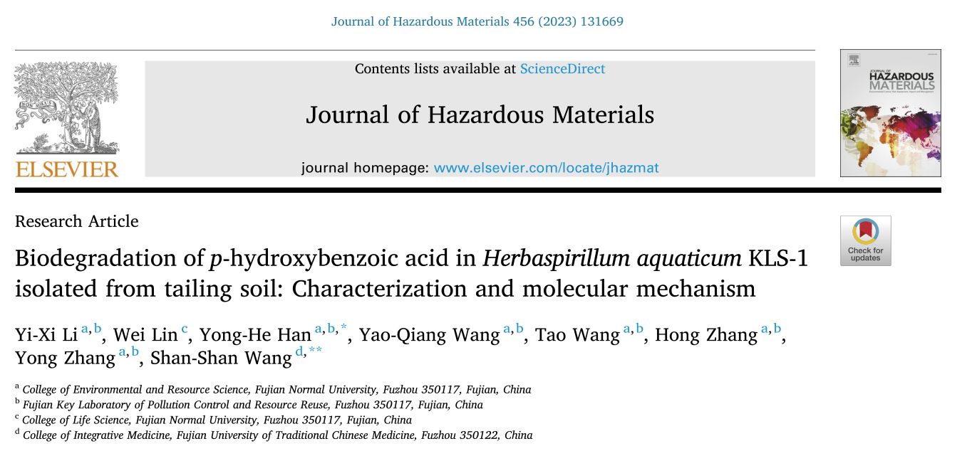 ※ IF=14.224. Yi-Xi Li, Wei Lin, Yong-He Han et al. Biodegradation of p-hydroxybenzoic acid in Herbaspirillum aquaticum KLS-1 isolated from tailing soil: Characterization and molecular mechanism. Journal of Hazardous Materials: 456 (2023) 131669.