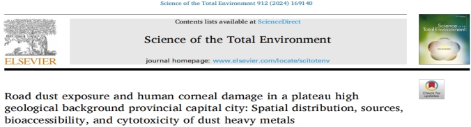 ※ IF=9.8: Zi-Yue Yang,Hai Liu,Jing-Ya Li,et al. Road dust exposure and human corneal damage in a plateau high geological background provincial capital city: Spatial distribution, sources, bioaccessibility, and cytotoxicity of dust heavy metals. Science of the Total Environment,912 (2024) 169140.