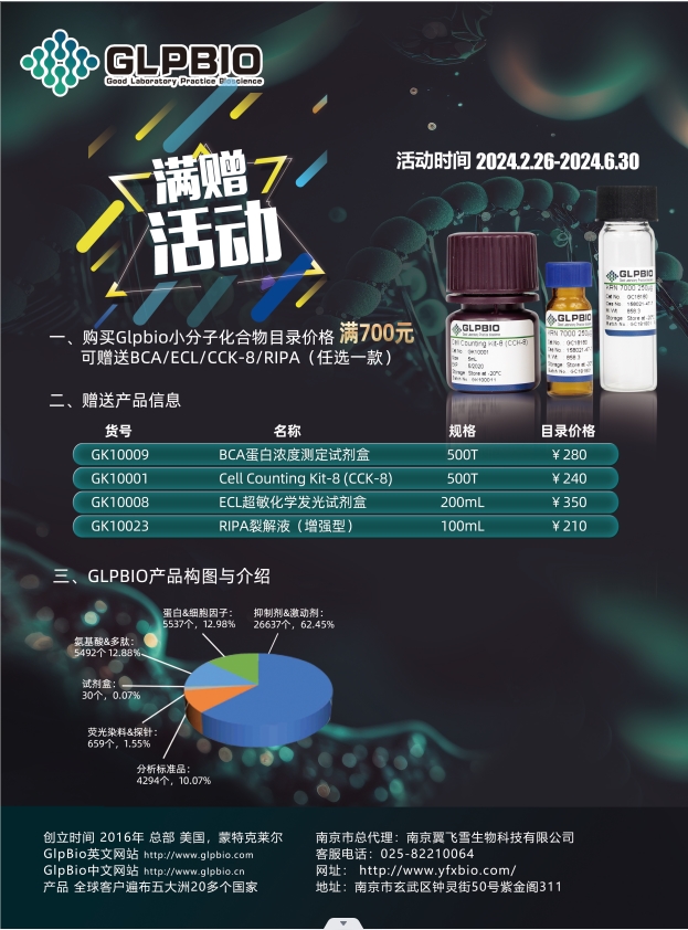 购买Glpbio产品每满¥700元,可任选CCK8、RIPA、BCA、ECL试剂盒一个