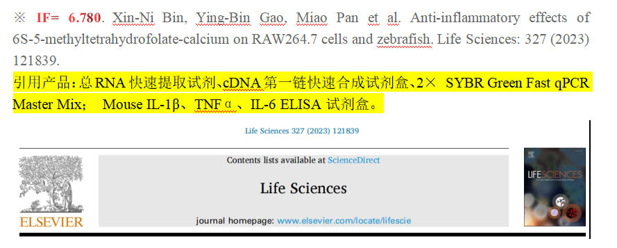 一篇文献引用了翼飞雪RNA提取-cDNA合成-qPCR,以及Mouse TNFa、IL-6、IL-1β ELISA试剂盒
