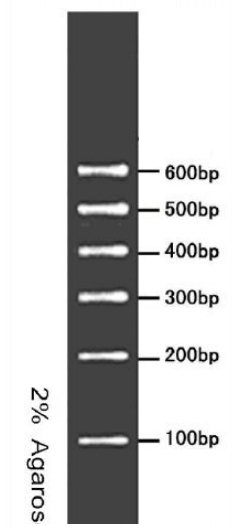 DNA MarkerⅠ由DNA片段 600bp、500bp、400bp、300bp、200bp 以及100bp构成,其中每条带DNA量约为50ng,适用于琼脂糖凝胶电泳中DNA条带的分析,不适用于Acrylamide凝胶电泳。