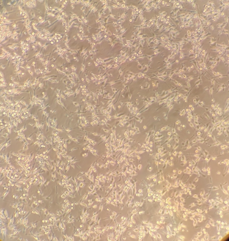 2、加入0.25%(w / v)胰蛋白酶-0.53 mM EDTA于培养瓶中(T25瓶1-2mL,T75瓶2-3mL)置于37℃培养箱中消化1-2分钟(难消化的细胞可以适当延长消化时间),然后在显微镜下观察细胞消化情况,若细胞大部分变圆并脱落迅速拿回操作台,轻敲几下培养瓶后加入3-4mL含10%FBS的培养基来终止消化。